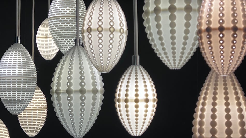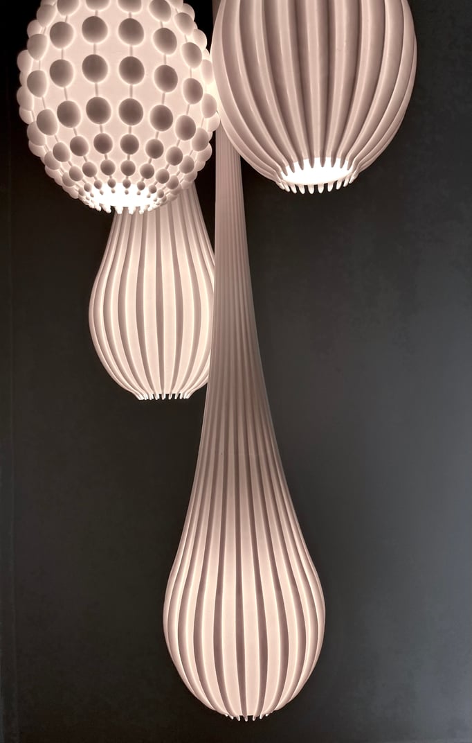 éclairées de l'intérieur, explore un jeu subtil entre transparence et relief, permettant de concevoir une variété de dessins et de motifs, à la fois graphiques, organiques ou minéraux, grâce à un éclairage inspiré des lignes naturelles.